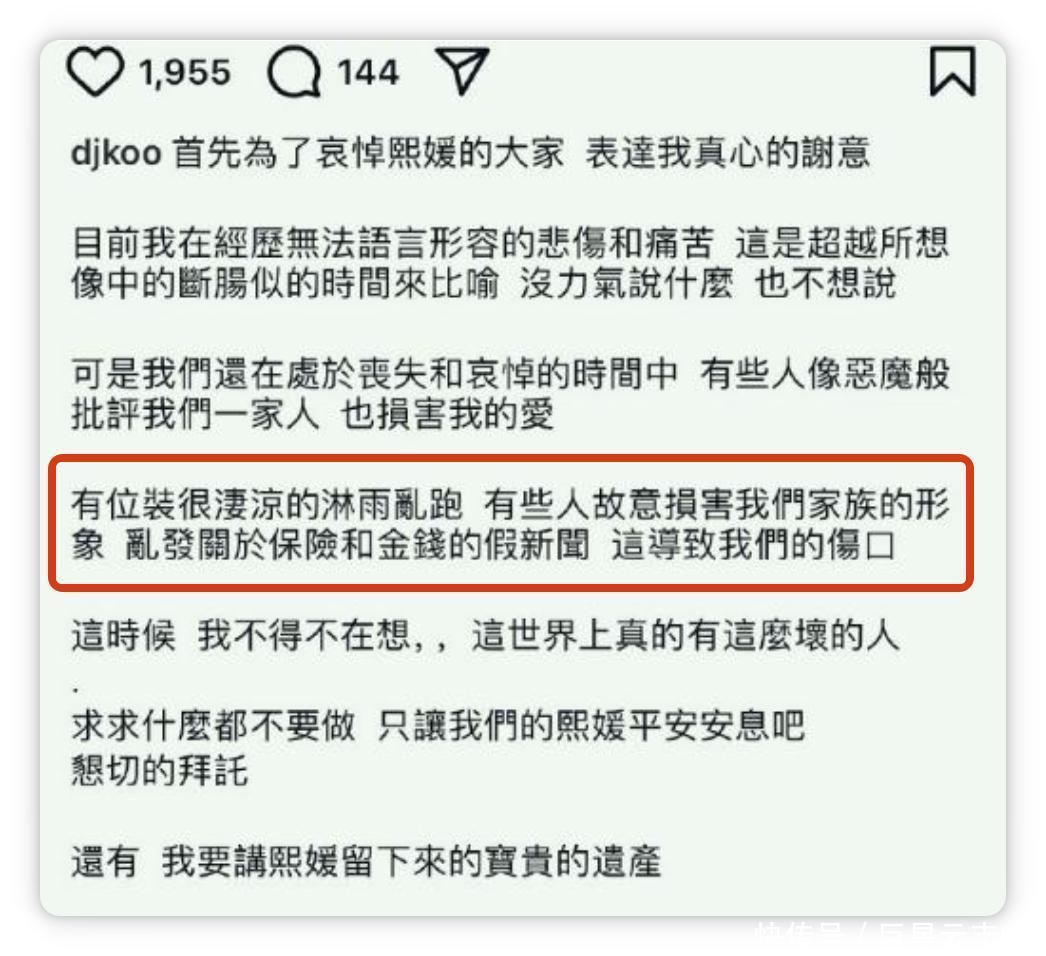 此前媒体曝光的几十保险,还有具俊晔为了遗产怎样怎样,长文中也澄清了,那些都是假新闻,是在往他们伤口上撒盐。