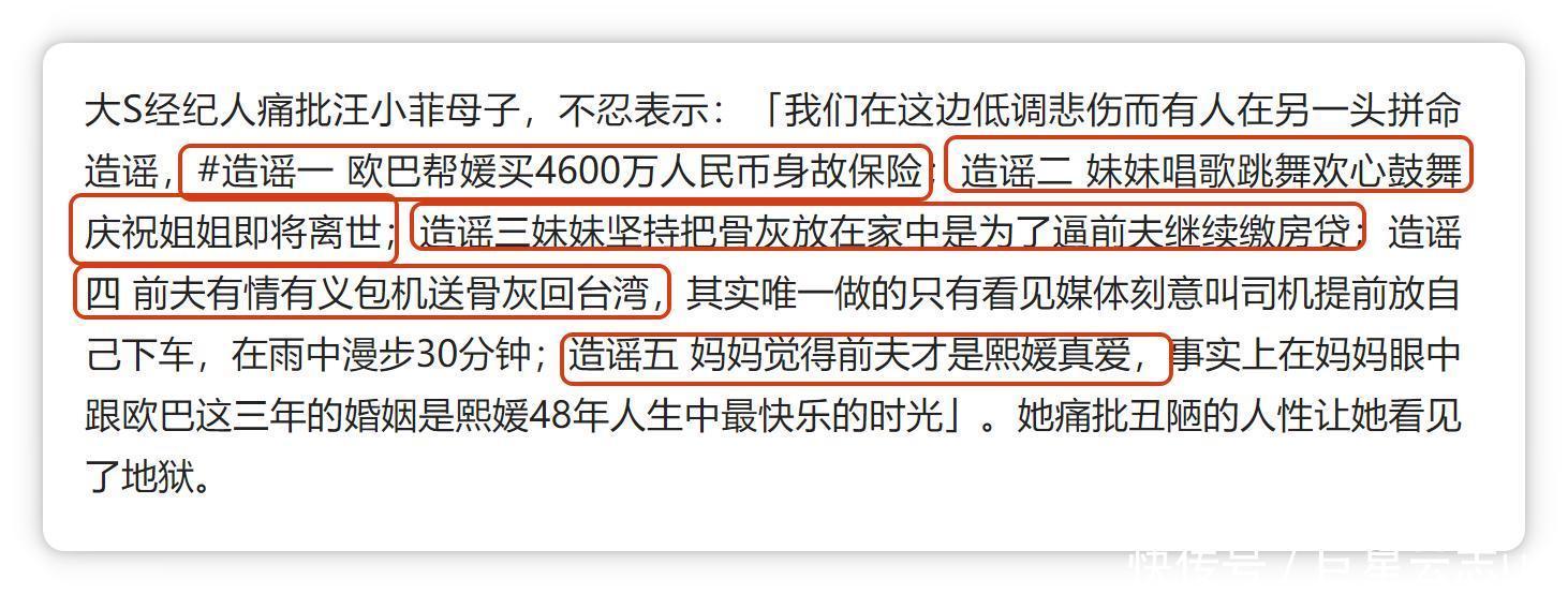 大S经纪人为了配合具俊晔,目前也把矛头指向汪小菲,痛批汪小菲母子造谣,并历数其的五个造谣。