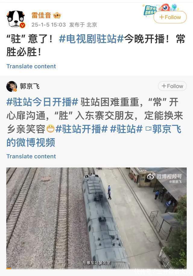 雷佳音发了一条微博,宣传好朋友郭京飞的新剧《驻站》。